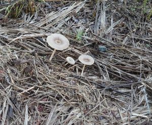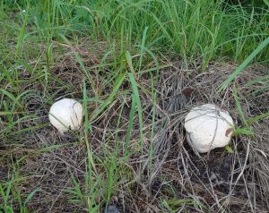 そして、秋は、キノコの季節です。先日、続いていた雨が上がった日にふと見ると、農場のわきの道端に、2種類の大きなキノコが出ていました。1つは、昨年は茶色になってから見つけた(2024年10月号参照)オニフスベのようです。秋も(と言ってもまだまだ暑いですが)キャンパスではいろいろな自然に触れることができ、散策は楽しいです。