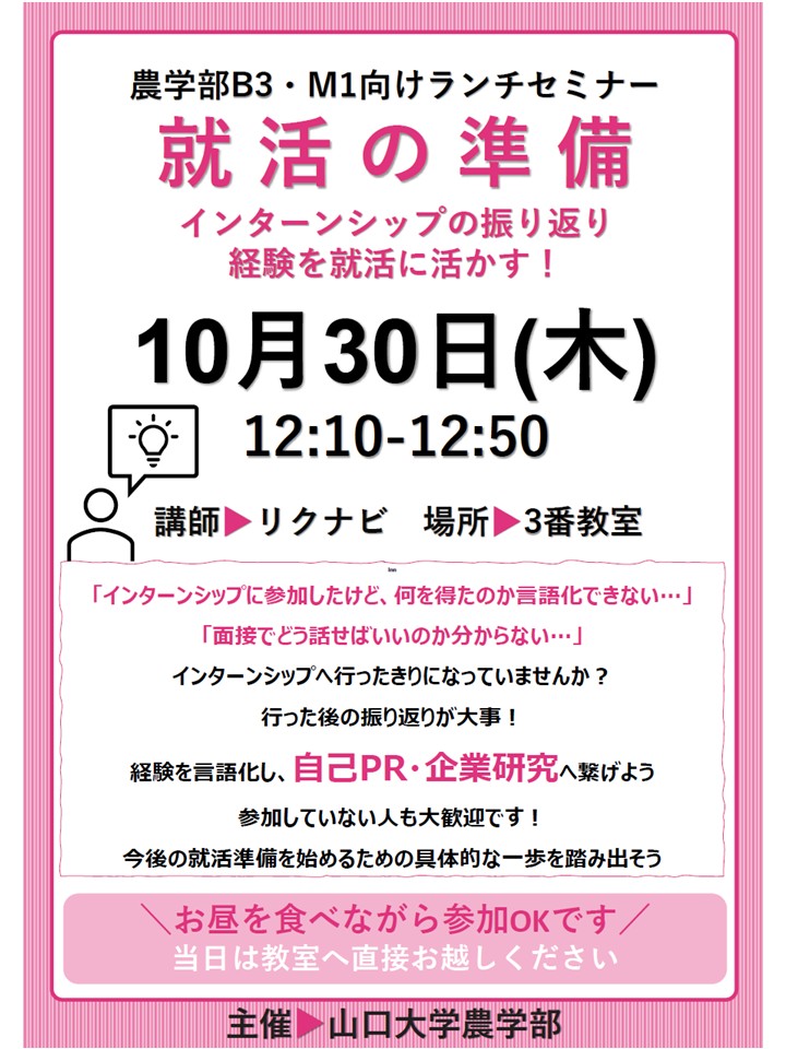 リクナビによる就職ランチセミナー開催(10/30) HOME 農学部案内 学科・大学院・附属施設 教員・研究紹介 理念・目標 入試情報 HOME 新着情報 リクナビによる就職ランチセミナー開催(10/30) 2025.10.03