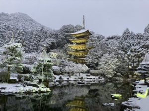 山口市が誇る瑠璃光寺の五重塔ですが、令和の大改修が年末に終了し、今、優美な姿を間近で見ることができます(大みそかのNHKのゆく年くる年でも紹介されていました)。ライトアップされており、うっすら雪化粧した姿は幻想的で、まるで絵画のようです。
