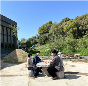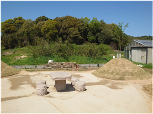 自然豊かな環境では、未利用地はすぐに藪のようになってしまいますので、伐採、除草を行い、学生さん達が憩える空間としての整備を試みました。あわせて、本学の園芸学分野の教授であった故弥富忠夫先生のご遺族から頂いたご寄附を活用し、石のテーブルを設置しました。