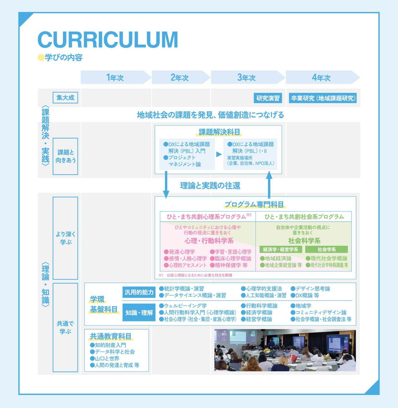 1~3年次にかけて、心理学・行動科学、経済学・経営学、社会学、地域学、データサイエンス、デジタル技術・AI技術とその活用等の基礎を「学環基盤科目」の履修を通して共通で学びます。