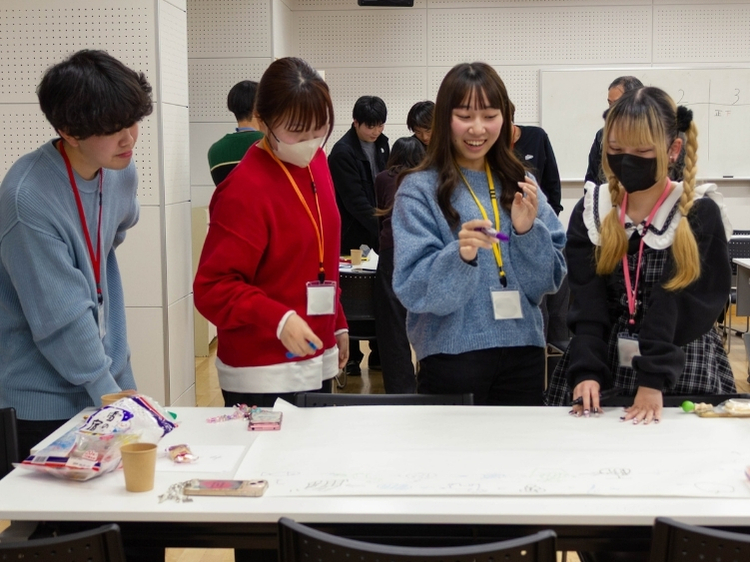 2025年12月16日(火)、山口市湯田地域交流センターにおいて、山口大学 ひと・まち未来共創学環、山口県立大学 国際文化学部情報社会学科、山口学芸大学 文系DX教員養成プログラムの3大学の学生合計31名が参加し、合同の交流イベントを開催しました。