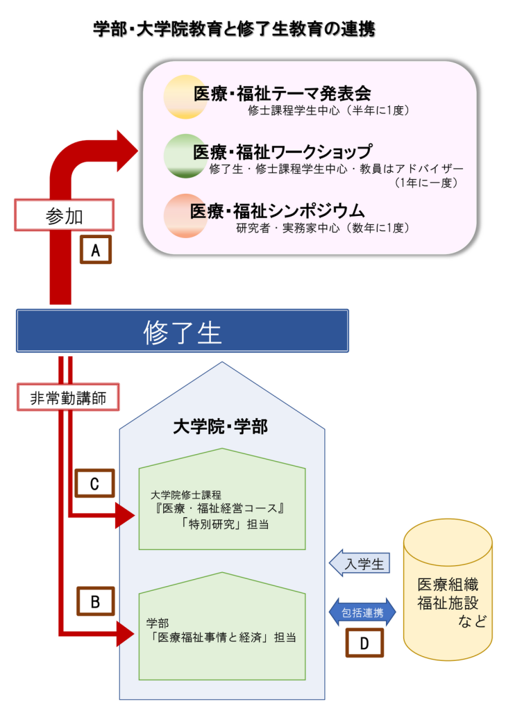 平成29年度よりこのコースを担当する組織として新たに「医療・福祉経営コース運営委員会」が創設されました。このコース運営委員会は、現役生・修了生と経済学部との新たな関係づくりを試みております。それは一口で言えば、両者の関係をWIN-WINの状況にしていくというものです。この新たな試みを図にしたものが裏面に掲載されています。