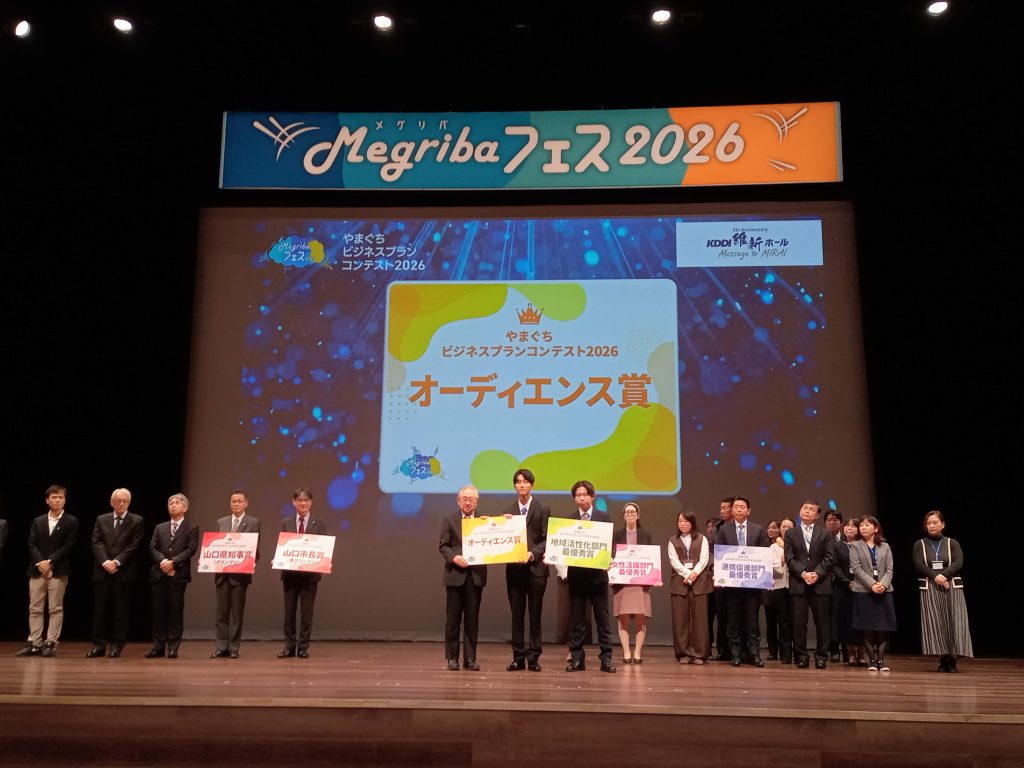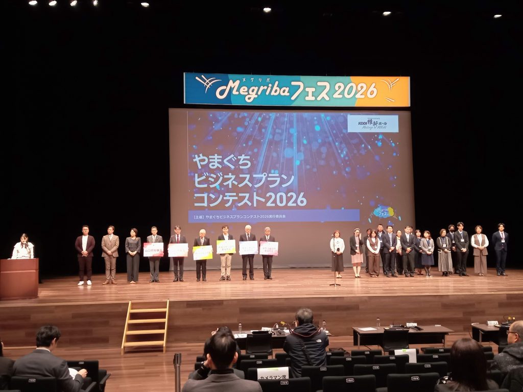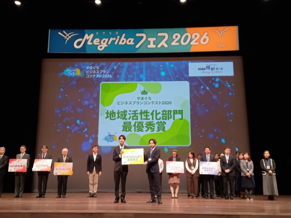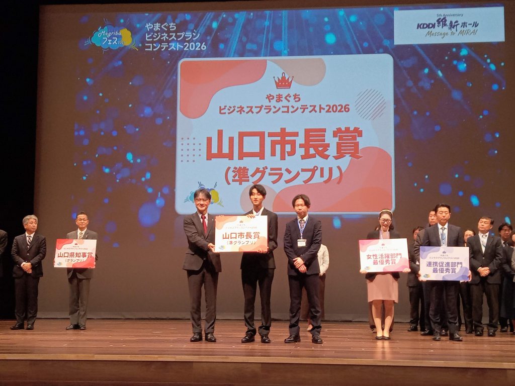 1月17日にKDDI維新ホール大ホールにて、山口県や山口市らで主催する「やまぐちビジネスプランコンテスト2026」最終審査会が開催されました。本学部経営学科宮井ゼミ所属の藤本航生くん、吉崎陽くんのチームが最終プレゼンに臨み、準グランプリ(山口市長賞)・地域活性化部門最優秀賞・オーディエンス賞の3賞を獲得しました。