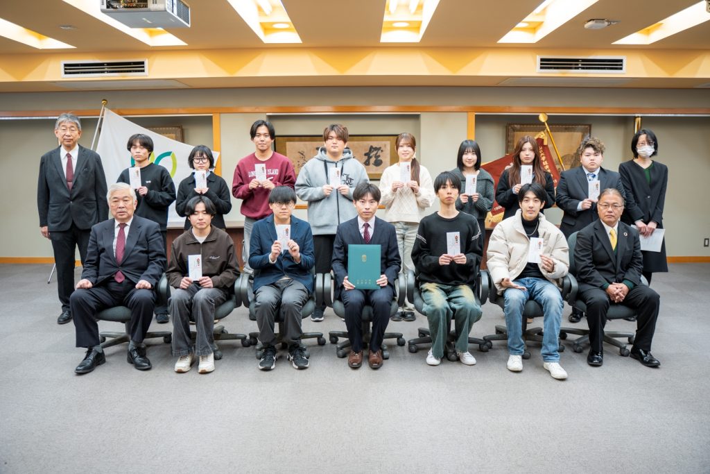 また、「山口大学経済学部教育後援会資格取得等報奨金制度」は、学生の自発的な学習と資格取得を支援するため、令和7年3月に新設された制度です。本制度は、学部が指定する資格・検定試験において優れた成績を収めた学生に対し、その努力を奨励し、報奨金を授与するものです。第2回目となる今回は、税理士試験科目に合格した14名(1名欠席)に報奨金が授与されました。今回は2年生の合格者が多く、低年次からの活躍が目立ちました。