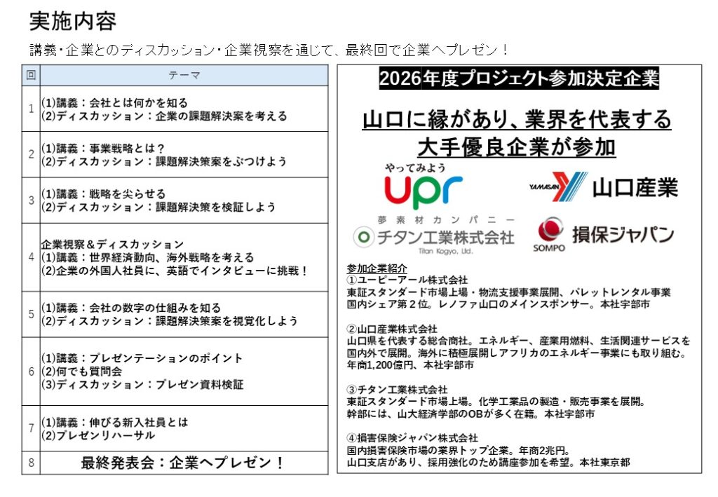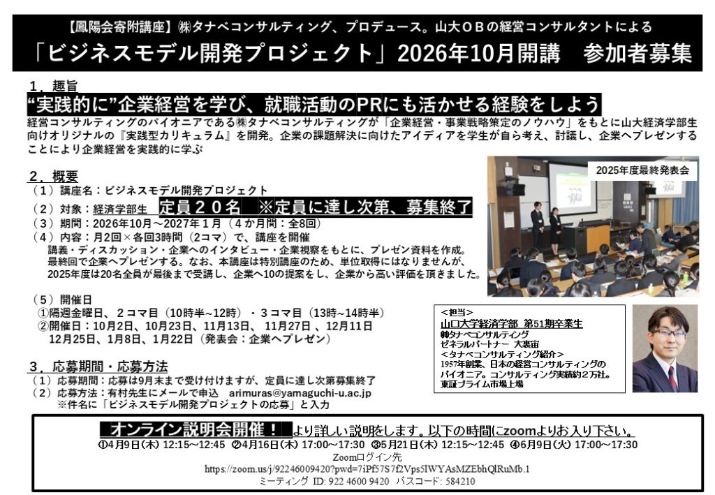 令和7年度に開講した㈱タナベコンサルティング・プロデュース「ビジネスモデル開発プロジェクト」(鳳陽会寄附講座)を令和8年度にも開講することが決定しました。昨年度同様に後期の金曜日、2コマ目と3コマ目の2コマ連続で計8回開講します(隔週開講)。詳しいことは、案内ビラをご覧ください。また、オンライン説明会の日時も案内ビラに記載しています。