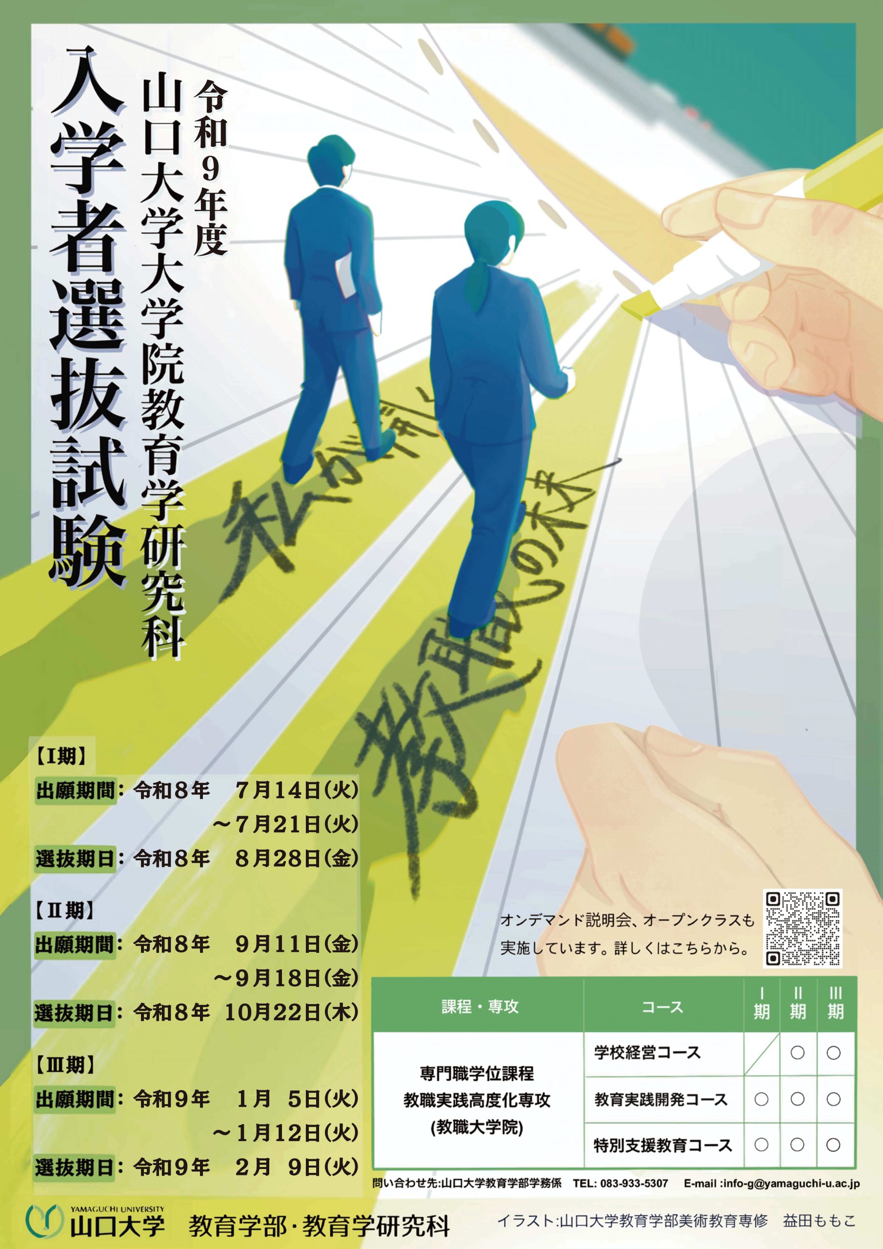 教職大学院(学校経営コース・教育実践開発コース・特別支援教育コース) 入学者選抜試験のポスターを掲載しました HOME 学部案内 学部⻑あいさつ 理念・⽬標 AP・CP・DP 組織 交通案内 学部のあゆみ プロジェクト報告書 ⼤学院案内 教育 教育概要 教育実習 国際交流 ちゃぶ台プログラム ⾼⼤連携 就職支援について 取得可能免許等 卒業後の進路 ⼊試 HOME 新着情報 教職大学院(学校経営コース・教育実践開発コース・特別支援教育コース) 入学者選抜試験のポスターを掲載しました 掲載日:2026年3月25日 教職大学院(学校経営コース・教育実践開発コース・特別支援教育コース)入学者選抜試験のポスターを掲載しました。