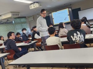 ちゃぶ台プログラム「まなびのつながりプロジェクト(まなプロ)」は、中学生や高校生が大学生とともに“未体験”を楽しみ、仲間づくりをとおして、人と人とのつながりが結ばれることを目的とする企画です。今年度の「冬のまなびのつながりプロジェクト」は、初の中学生を対象とした企画を実施しました。「大学生の1日を中学生に体験してもらう」ことをねらいとして、アイスブレイクに始まり、講義体験や学食体験、そして座談会を行いました。講義体験では、大学ならではの「履修登録」の後、岡村吉永教授、鷹岡亮教授、沖林洋平准教授の授業を受講してもらいました。初の中学生対象企画にもかかわらず、12名もの中学生に来学いただき、新たなつながりをたくさん結ぶことができました。