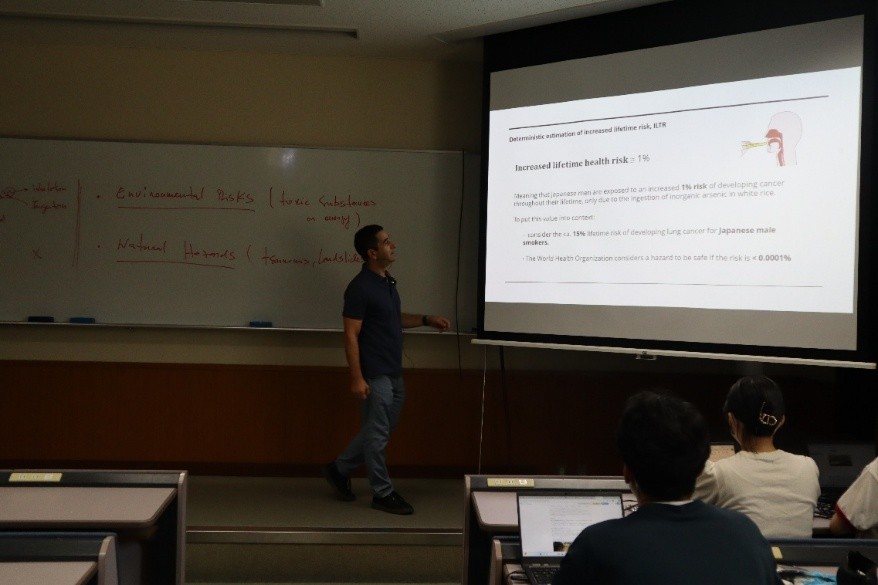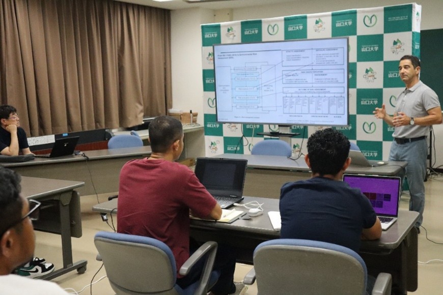 The lectures focused on the theme of Environmental Risk Assessment. Professor Nunes covered the fundamental concepts and principles of environmental risk management, introducing common tools and methodologies. He also explored the application of risk management modeling and highlighted the importance of risk communication. In addition to the lectures, a practical exercise was conducted using Excel, where participants estimated the health risks associated with arsenic in rice, a staple food in Japan, and proposed measures to mitigate these risks. The sessions were highly interactive, with lively discussions between Professor Nunes, faculty and students of Yamaguchi University, providing a valuable opportunity to deepen understanding.