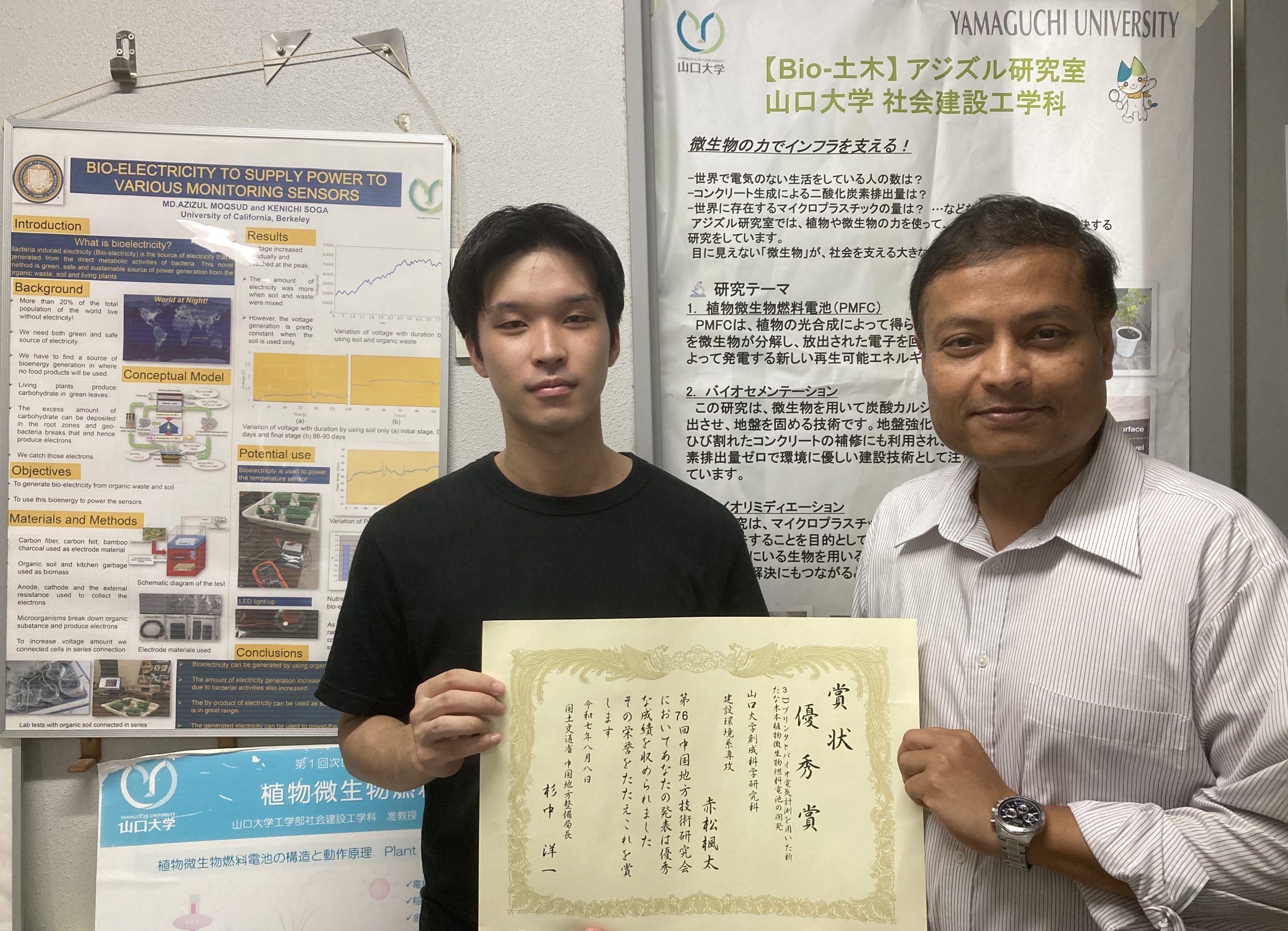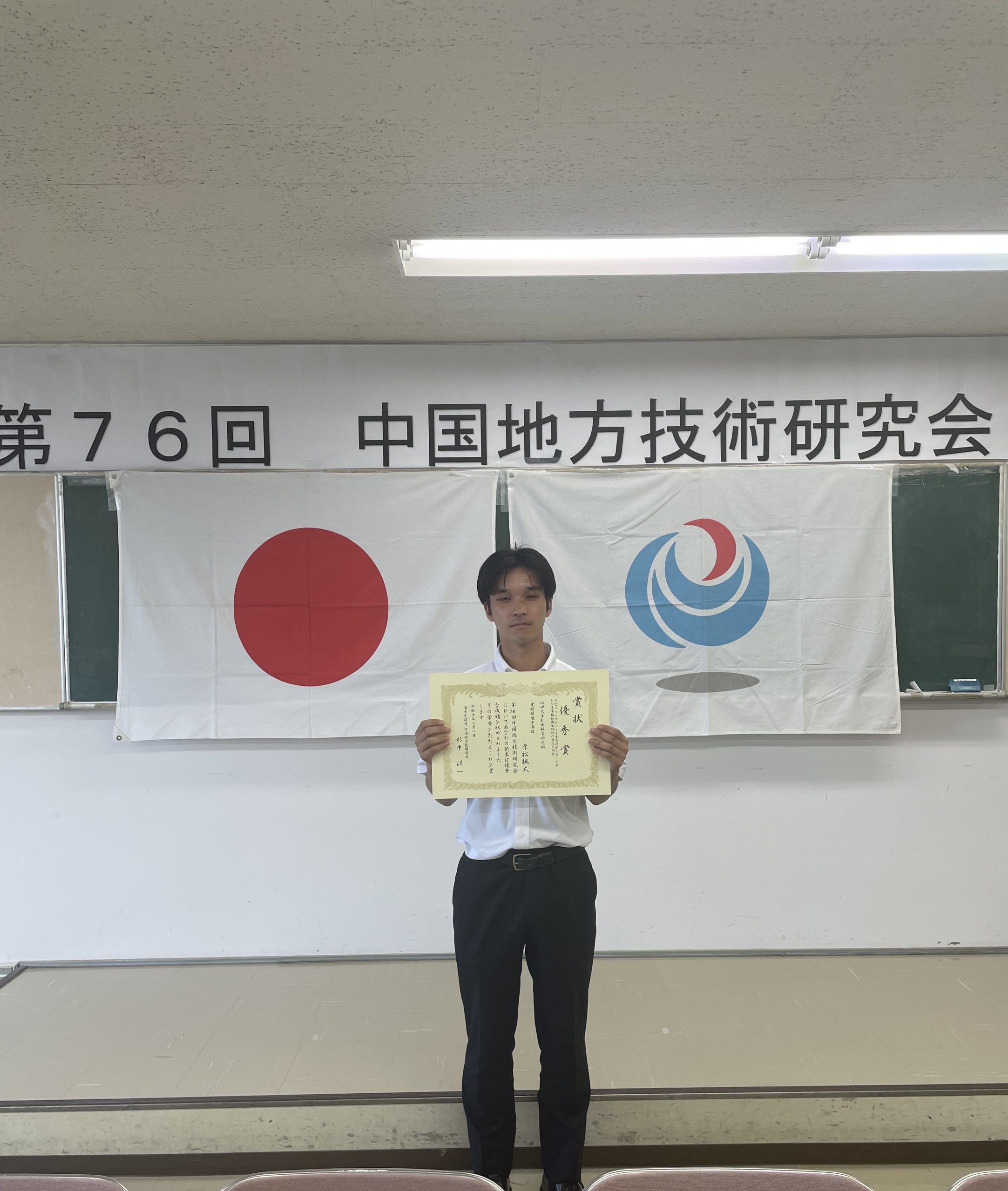 Futa Akamatsu, First-Year Graduate Student in the Department of Civil and Environmental Engineering (Assoc. Prof. MD.Azizul Moqsud Laboratory), Receives Excellence Award at the 76th Chugoku Regional Technology Research Meeting