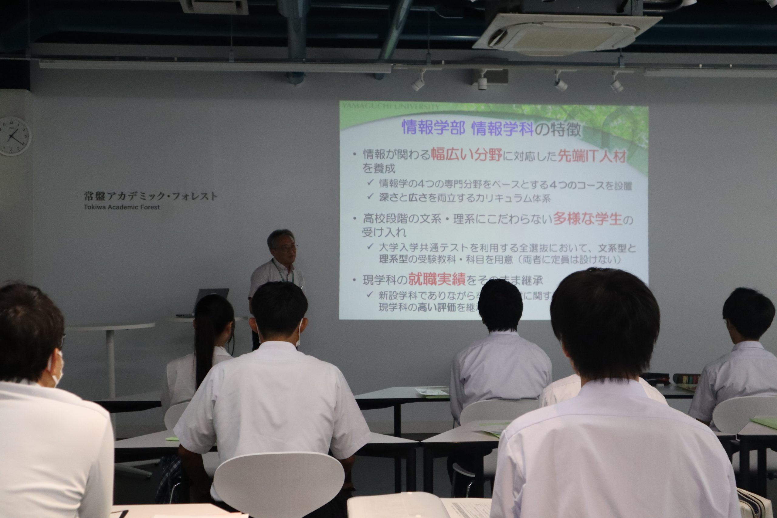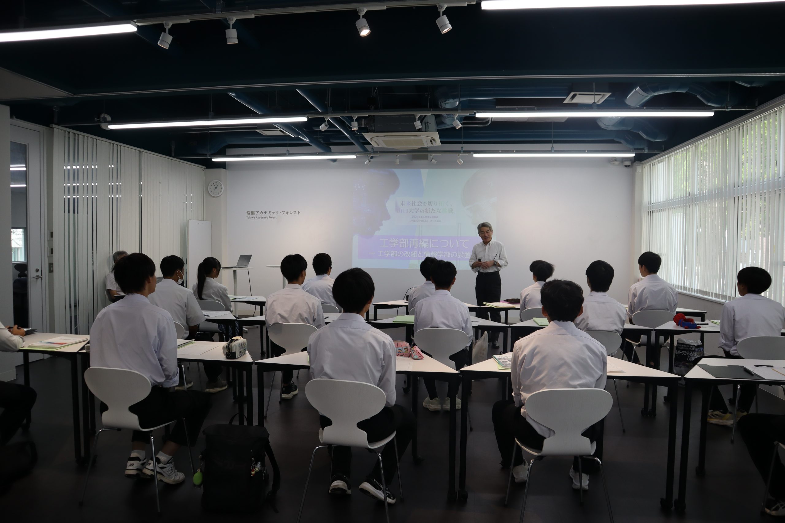 はじめに、山田工学部長及び多田村工学部長補佐(情報教育担当)から、山口大学、工学部及び来年度新設する情報学部の紹介がされました。