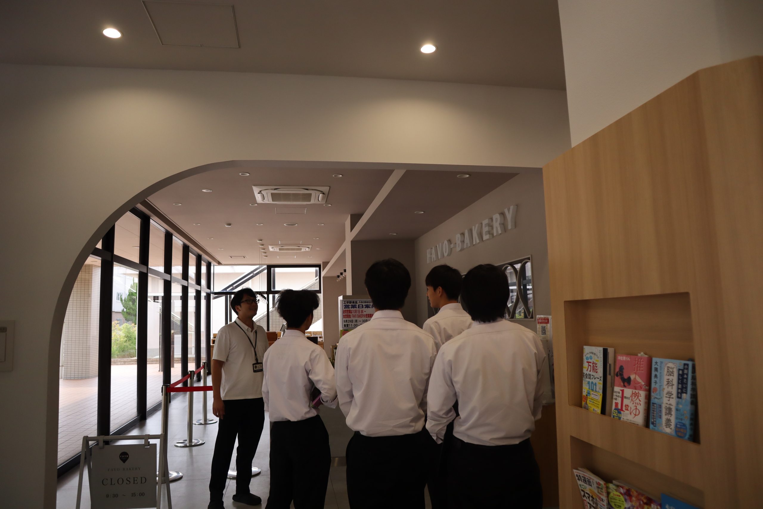 次に、図書館スタッフ及び案内で図書館を、生協スタッフの案内で福利厚生棟を見学しました。図書館では工学部ならではの専門書や資料、併設されたカフェを、福利厚生棟では食堂やベーカリーショップを見て回りました。