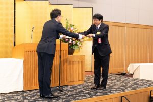 表彰式は、令和7年10月21日に東京都内で行われ、表彰状と記念品が授与されました。佐伯教授は「基礎研究も大事ですが、実用化研究や特許取得、標準化等、社会実装を見据えた取組を積極的に行うことは、大学の社会貢献を進めるうえで、大事なことであると考えています」と話しています。
