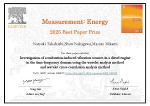 大学院創成科学研究科機械工学系専攻博士前期課程修了高橋菜月さん(現 本田技研工業株式会社所属)、同専攻博士前期課程修了中川駿さん(現 本田技研工業株式会社所属)と大学院創成科学研究科(工学系)機械工学分野三上真人教授が、Elsevier社の学術雑誌Measurement: Energyの2025年最優秀論文賞(2025 Best Paper Prize)を受賞しました。本賞は、学術雑誌Measurement: Energyに2025年に掲載された論文の中から、まず、ダウンロード統計に基づいて候補論文が選定され、次に、その中から編集委員の投票により1編が選ばれて表彰されるものです。