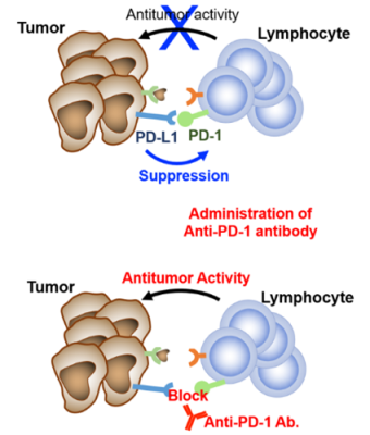 Immune checkpoint molecules are regulatory proteins that modulate immune responses. Representative examples include PD-1 on lymphocytes and PD-L1 expressed on tumor cells and immune cells. The mechanisms underlying immune checkpoint regulation were recognized by the 2018 Nobel Prize in Physiology. The binding of PD-1 to PD-L1 is one way by which tumor cells evade immune attack, as it suppresses the antitumor activity of tumor-infiltrating lymphocytes. Immune checkpoint inhibitor therapy blocks this interaction—typically using antibodies such as anti–PD-1 or anti–PD-L1—thereby restoring T-cell function and enhancing antitumor immunity.