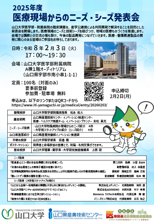 山口大学医学部附属病院では、山口県産業技術センターとの共催により、産学公連携による医療分野の課題解決および地域のものづくり推進を目的とした「2025年度 医療現場からのニーズ・シーズ発表会」を開催いたします。