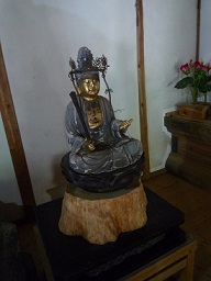 木で作った台座に鎮座する文殊菩薩坐像 -