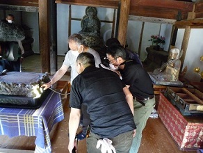 6月22日(火)山口市大内の興隆寺にて、現存する「普賢菩薩坐像」の台座の凹凸や色味などを調査した後、馬場客員教授が台座の表面が剥がれ落ちないための処理を行い、教育学部の彫刻室に運び込みました。今後、運び込んだ「普賢菩薩坐像」の台座のデザインを元に上原教授が「文殊菩薩坐像」の獅子台座と岩座を作成し、馬場客員教授が彩色を行い、来年の夏ごろ作業が完了する予定です。