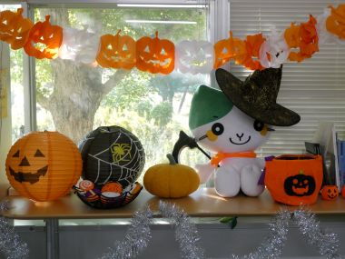 このイベントは、学部公認サークルが、留学生との交流を深めようと毎年企画・運営しているものです。イベントだけではなく、この日は事務室もハロウィン仕様に飾りつけを行い、学部棟でもハロウィンの雰囲気を楽しむ工夫を凝らしました。