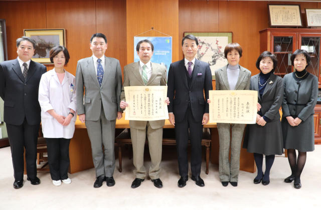 杉野病院長から受賞者に表彰状及び副賞が授与され、受賞の祝辞がありました。長谷川栄養治療部長、原田看護部長、堀尾副栄養治療部長、西村副看護部長、川村事務部長も同席し、受賞を祝しました。