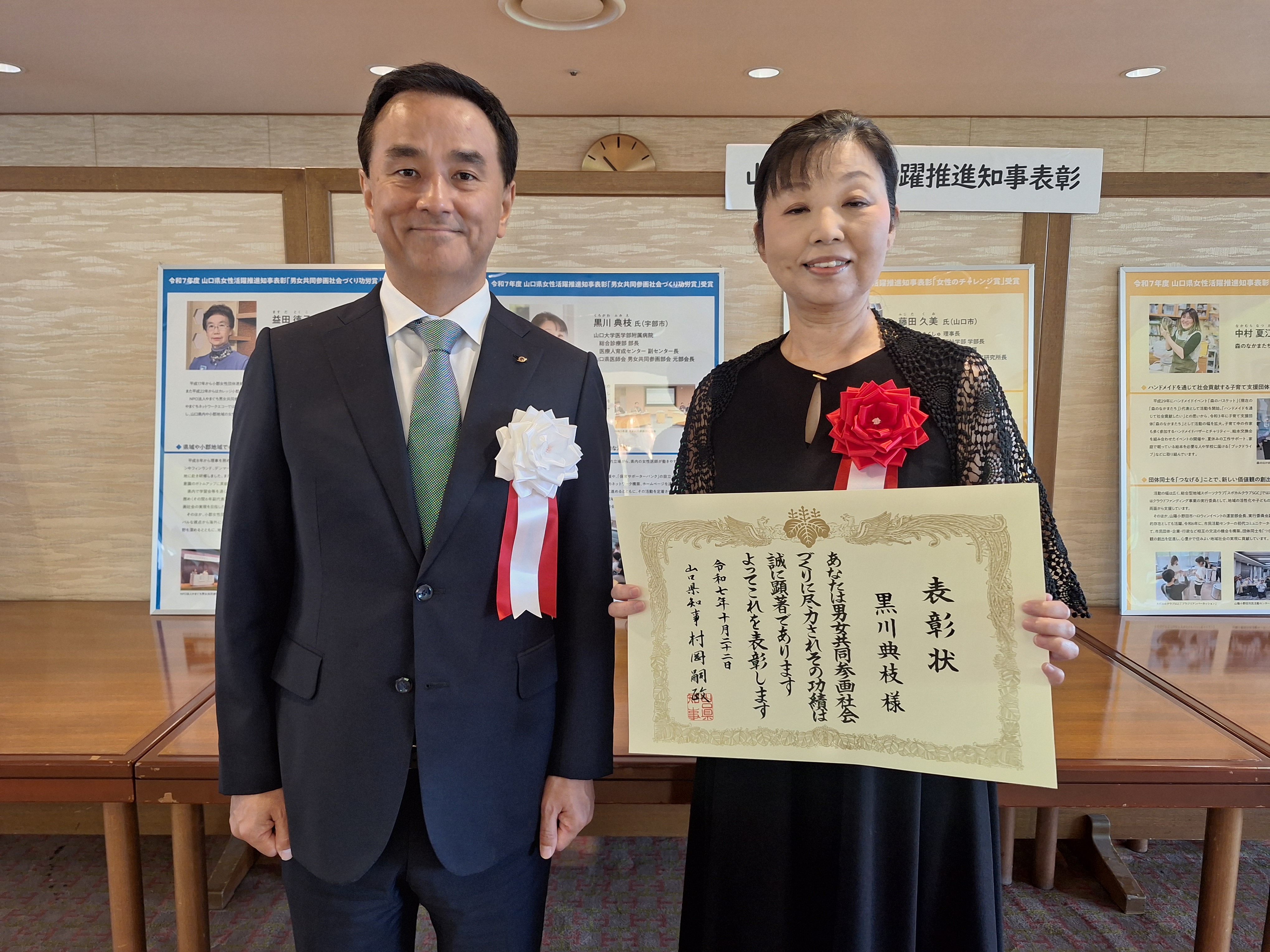 このたび、本院総合診療部長の黒川典枝教授が、令和7年度 山口県女性活躍推進知事表彰「男女共同参画社会づくり功労賞」を受賞しました 。この表彰は、黒川教授の山口県医師会の男女共同参画部会における、17年以上にわたる女性医師支援の活動の基盤づくりや発展への多大な貢献が認められたものです。
