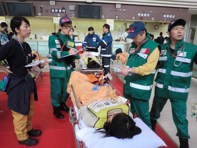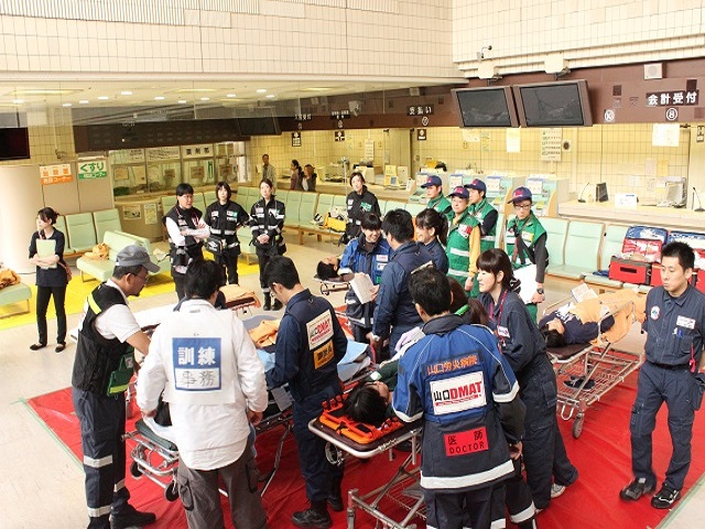今回の訓練は参加者数が約300人で、本院にも県内外からDMAT 6 隊が参集し、被災現場から多数搬送されてきた患者さんへの救急処置、また本院では収容しきれなくなった患者さんを県外の病院に搬送するために、山口宇部空港へと実際に搬送する訓練を行いました。山口宇部空港においても、本院のDMAT隊が指揮をとり、搬送されてきた多数の患者さんを県外に搬送するまでの救護及び調整訓練を行いました。