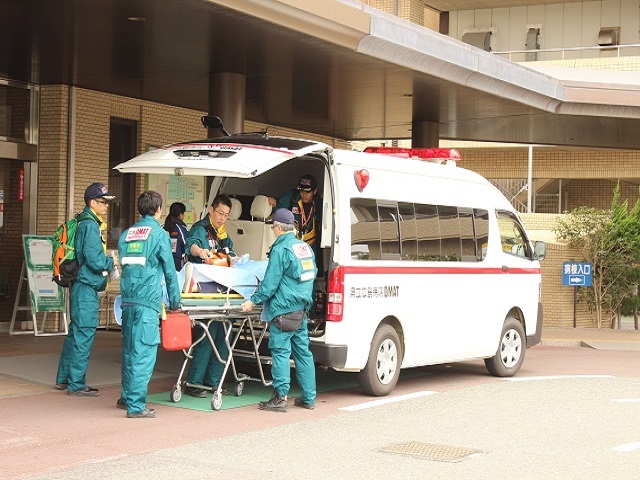 DMAT(ディーマット)とは、大規模災害等が発生した場合に、急性期に現場等で活動できる機動性を持った医療チームのことです。特別な研修を受けた医師、看護師、業務調整員で構成されており、本院は3チームのDMATを派遣する体制を整えています。