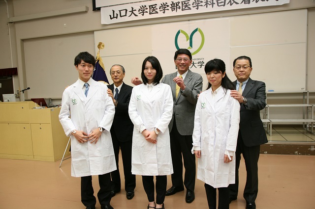 1月29日(金),医学部医学科白衣着衣式を挙行しました。この式典は,平成19年度から毎年,本学医学部医学科同窓会である霜仁会(そうじんかい)から,臨床実習に臨む学生に白衣が贈られ,これから始まる臨床実習を前に医学生としての決意と自覚を確認するもので,山下医学科長,福本霜仁会会長,田口医学部附属病院長をはじめ関係者が列席しました。