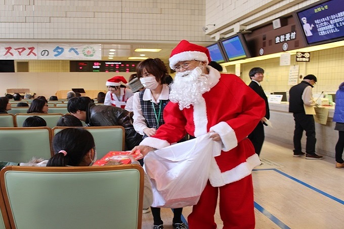 開演に先立ち、外来棟ロビーに集まっていただいた入院患者さん達へ、サンタに扮した田口病院長及び検査部、放射線部、薬剤部のメディカル・スタッフから、クリスマスプレゼントが配られました。