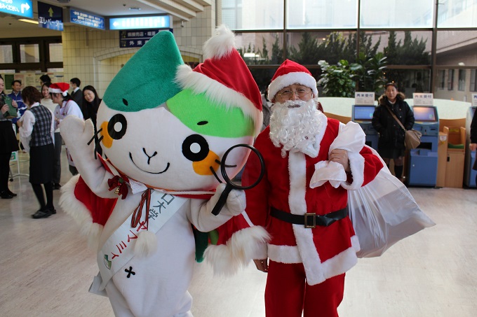 山口大学のマスコットキャラクターである「ヤマミィ」も駆けつけて、プレゼント配付を手伝い、プレゼントを手渡された患者さん達は大変喜ばれ、握手などを行っていました。