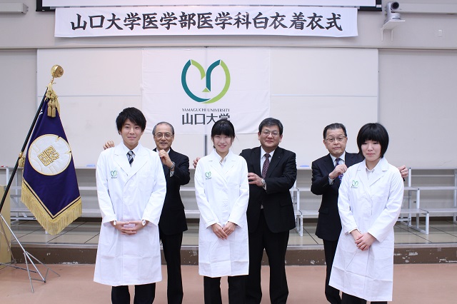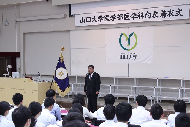 その後、学生代表の口分田啓さんから「初心を忘れず、臨床実習を充実したものにするために白衣を頂いたこの日から、山口大学の看板を背負うことを自覚し、地域社会への貢献のため、日々精進していくことを誓います」と宣誓がありました。続いて、田口医学部附属病院長から期待を込めた挨拶があり、学生全員が医学生としての決意と自覚を新たに白衣着衣式を終了しました。