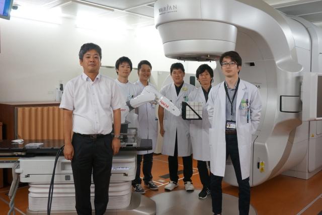 放射線治療室内に設置された開発したロボットシステムと研究チーム
