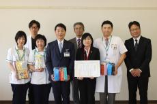 贈呈式では、骨髄バンクを支援する山口の会 猶絵美 会長から杉野病院長にシャープペンシル、スケッチブックなどの文房具が手渡され、杉野病院長からは感謝状を贈るとともにご厚意に対する感謝の意が述べられました。