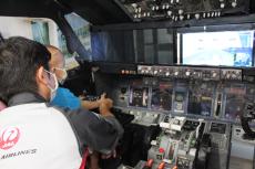会場にはJALの整備士が手作りした段ボール製の原寸大コックピットが設置され、子ども達は操縦席に座って、航空シミュレーション画面を見ながら飛行機の操縦を疑似体験しパイロット気分を味わいました。