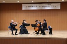 コンサートは,杉野病院長の挨拶により開演し,ヴァイオリンの町田匡さん,ヴァイオリンの岡田紗弓さん,ヴィオラの小中澤基道さん,チェロの横山桂さんが,モーツァルトの「弦楽四重奏曲第17番『狩』」,「80日間世界一周」,「エデンの東」,「猫のセレナーデ」,「川の流れのように」,「ふるさと」等を演奏されました。