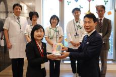 贈呈式では、骨髄バンクを支援する山口の会 猶 克美 会長(代理 猶 絵美さん)から杉野病院長にシャープペンシル、スケッチブックなどの文房具が手渡され、杉野病院長からは感謝状を贈るとともにご厚意に対する感謝の意が述べられました。