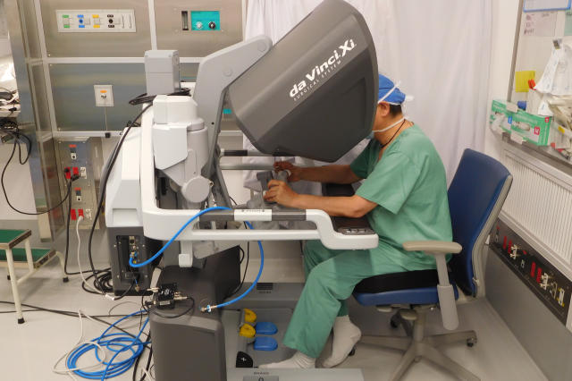 このロボット支援下手術とは、新しい内視鏡外科手術です。ただ、ロボット手術といっても、機械が自動的に手術を行うわけではありません。患者さんの胸やお腹にあけた小さな穴から挿入した手術機器と内視鏡をロボットアームにドッキングして、医師が離れた操作ボックスの中で内視鏡画像を見ながら鉗子(かんし)やカメラを操作して手術を行います。