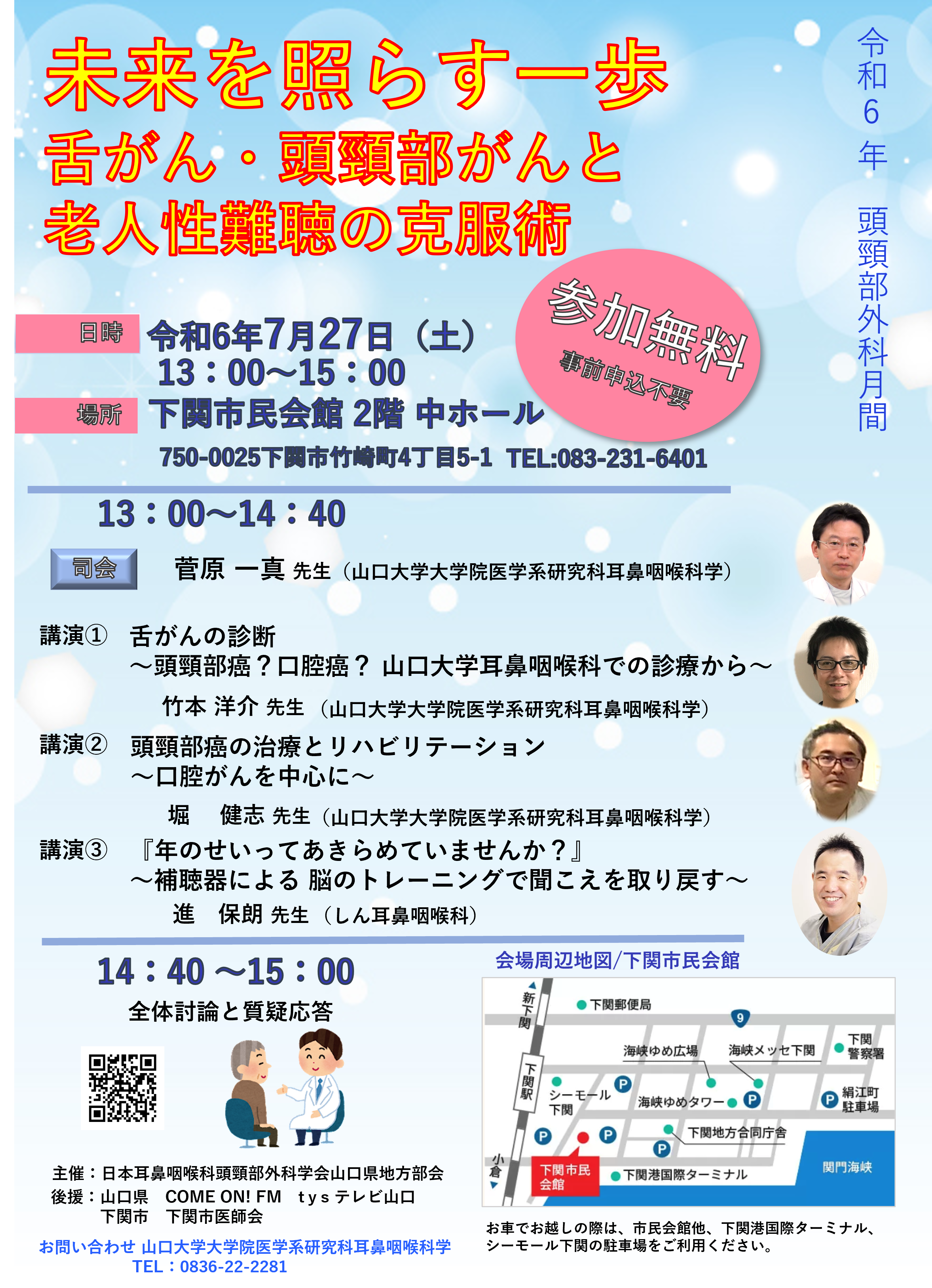 令和6年7月27日(土)13時より、下関市民会館2階中ホールにて市民公開講座「未来を照らす一歩 舌がん・頭頸部がんと老人性難聴の克服術」を開催します。