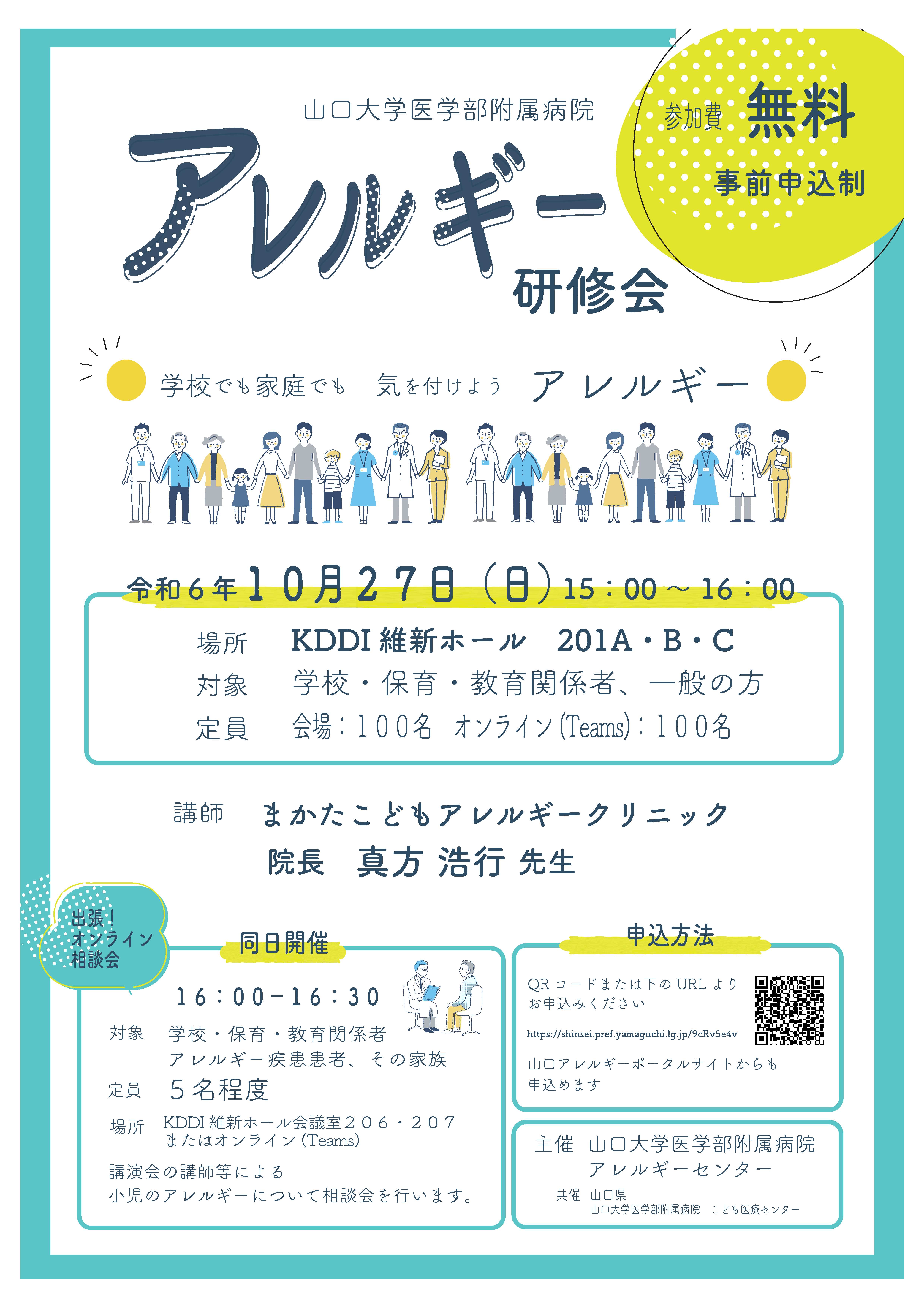 10月27日(日)15:00~ KDDI維新ホールにて山口大学医学部附属病院主催でアレルギー研修会を開催します。