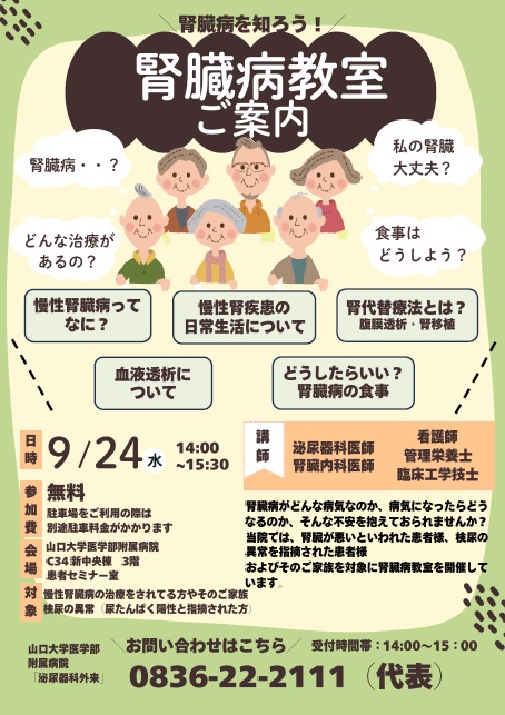 令和7年9月24日(水)14時から、本院新中央棟3階患者セミナー室(C34)において、「腎臓病教室」を開催します。腎臓病がどんな病気なのか、病気になったらどうなるのか、患者さんやご家族を対象に、医師や看護師、栄養士、臨床工学技士が、わかりやすくお話します。参加無料。くわしくは、下記ちらしをご覧ください。