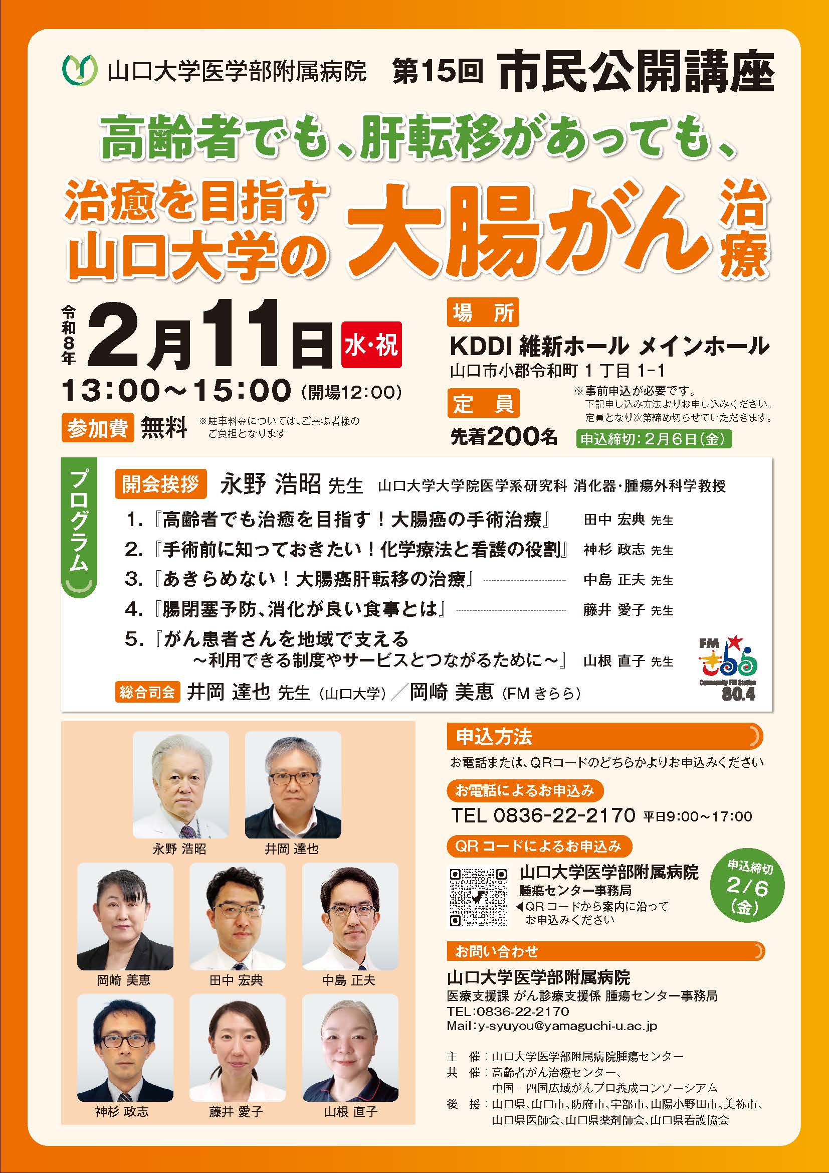 令和8年2月11日(水・祝)13時からKDDI維新ホールにおいて、腫瘍センター主催第15回市民公開講座「高齢者でも、肝転移があっても、治癒を目指す山口大学の大腸がん治療」を開催します。参加費無料(駐車場代は自己負担となります)、定員は先着200名です。