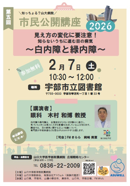 令和8年2月7日(土)10時30分から、宇部市立図書館にて、第5回知っちょる?山大病院 市民公開講座2026「見え方の変化に要注意!知らないうちに進む目の病気~緑内障と白内障~」を開催します。脂肪肝とお目の病気に関する正しい知識ついて、専門医が対談形式でわかりやすくお話します。参加無料。