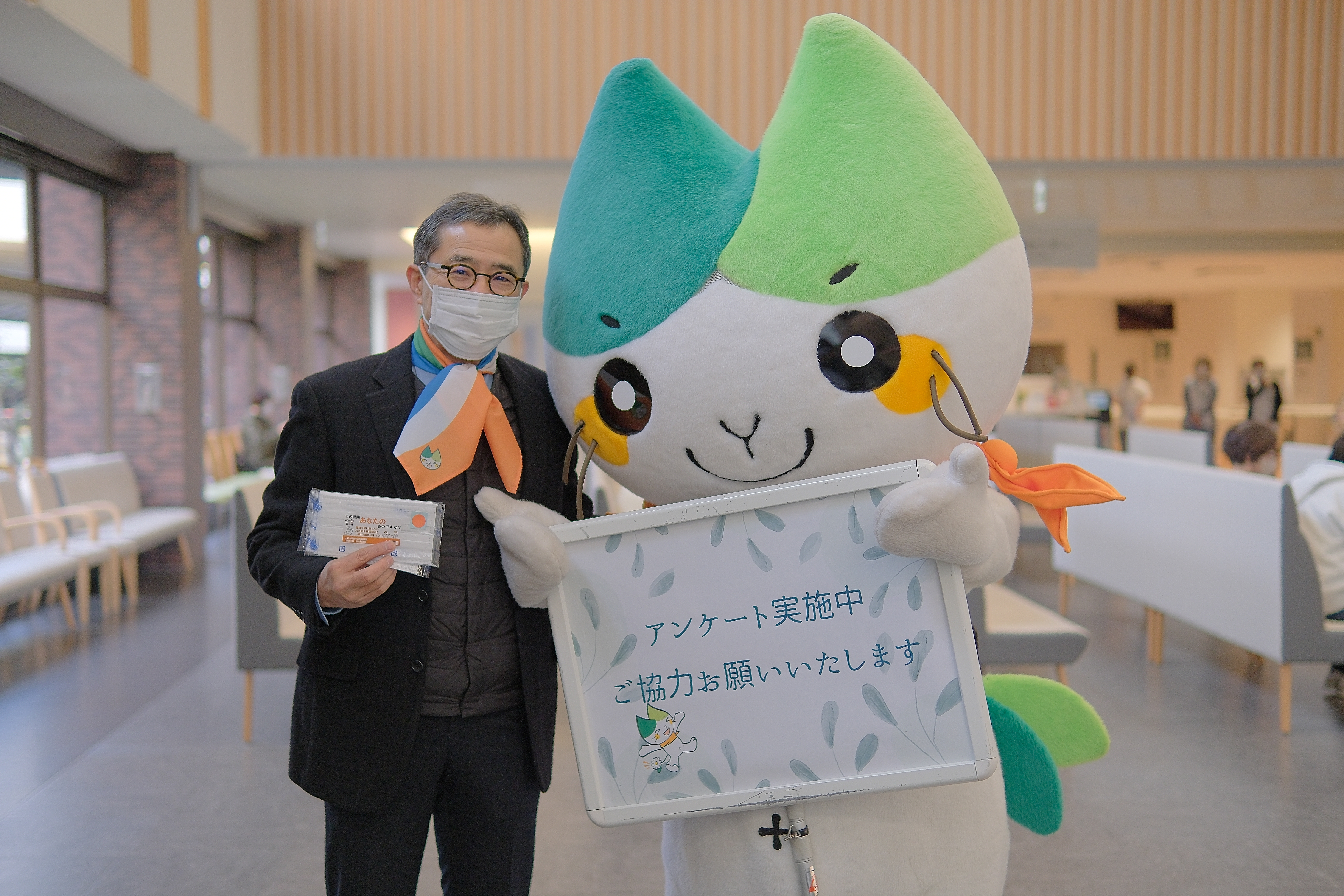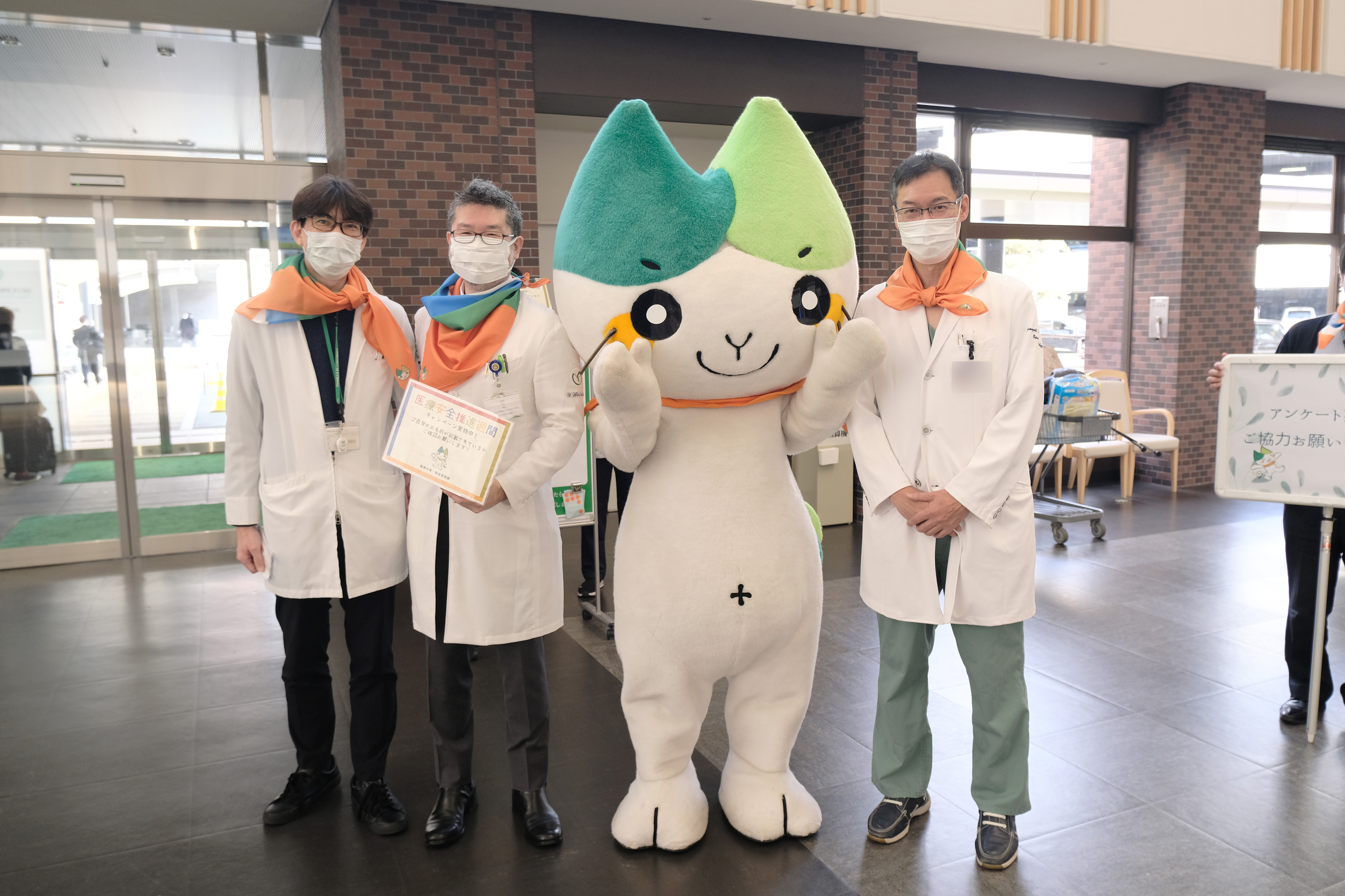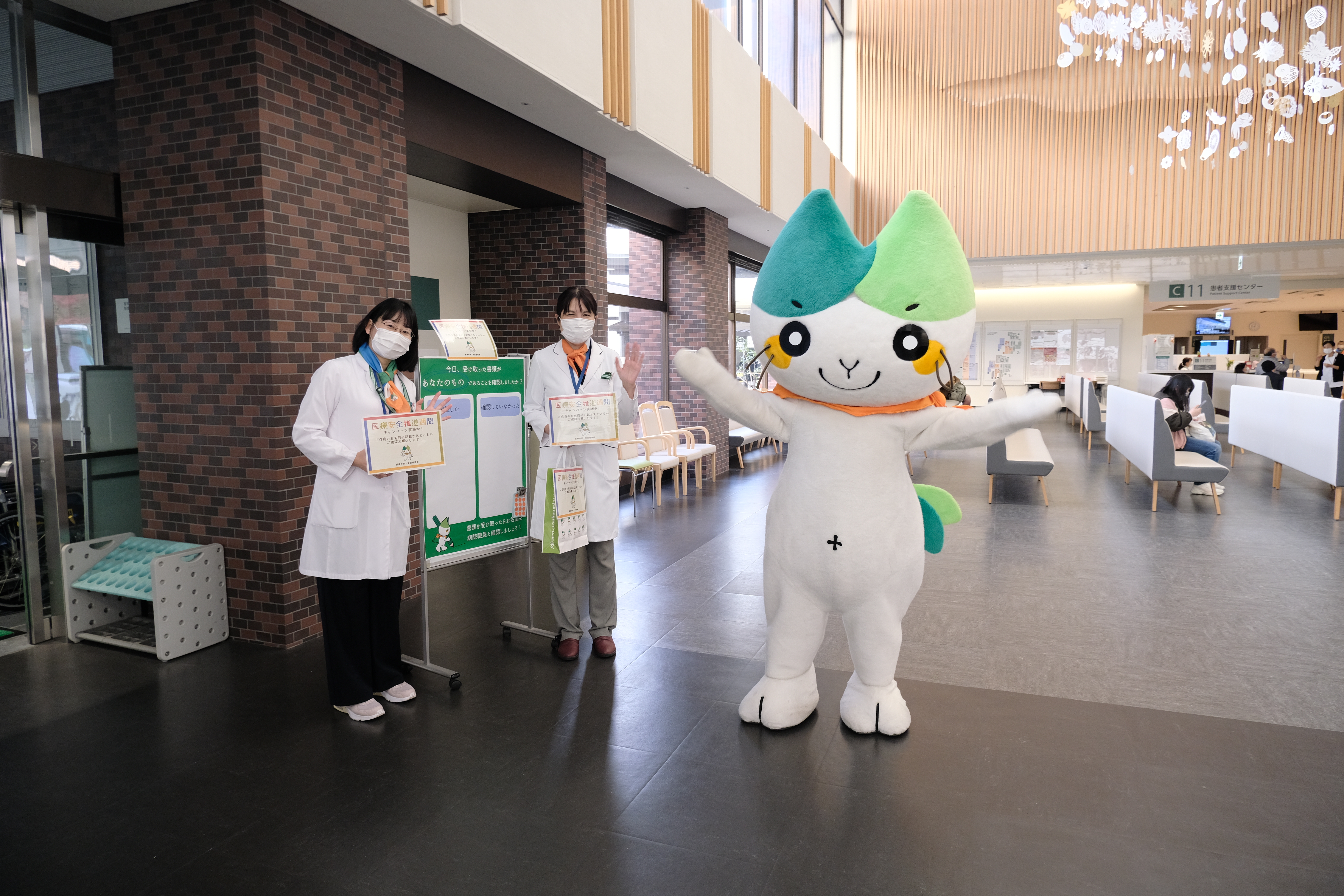 キャンペーンには、松永病院長をはじめ、白石副病院長、医療の質・安全管理部の渡谷部長、枝國感染制御部長、藤井看護部長や、多部署の職員も参加しました。