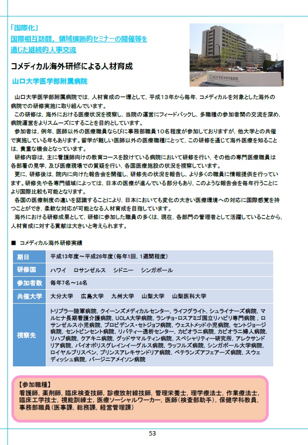 本院では、人材育成としての取り組みとして、医師以外の専門医療職、事務職員による海外研修を毎年行っています。研修の参加者は各国の医療施設の見学や教育コースを受講し、医療環境における国際感覚を磨く貴重な機会となっています。