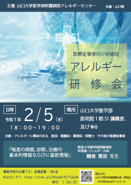 令和7年2月5日(水)、本院アレルギーセンター主催医療従事者向けアレルギー研修会を、山口大学医学部医明館1階S1講義室及びWEBで開催します。