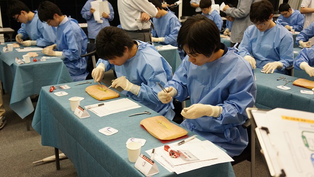WCCとは、研修医による外科の基本手技である創縫合閉鎖の上手さ、速さなどを競うコンテストです。初回となる今回は、山口県内の各臨床研修指定病院で指導医によるトレーニングを受け、選抜された研修医20名が参加しました。