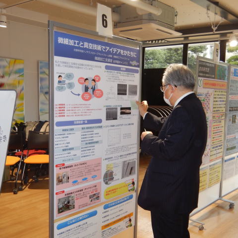 学内の知り合いづくりを応援するプロジェクト「私の研究紹介します」のポスター展示を学長が視察