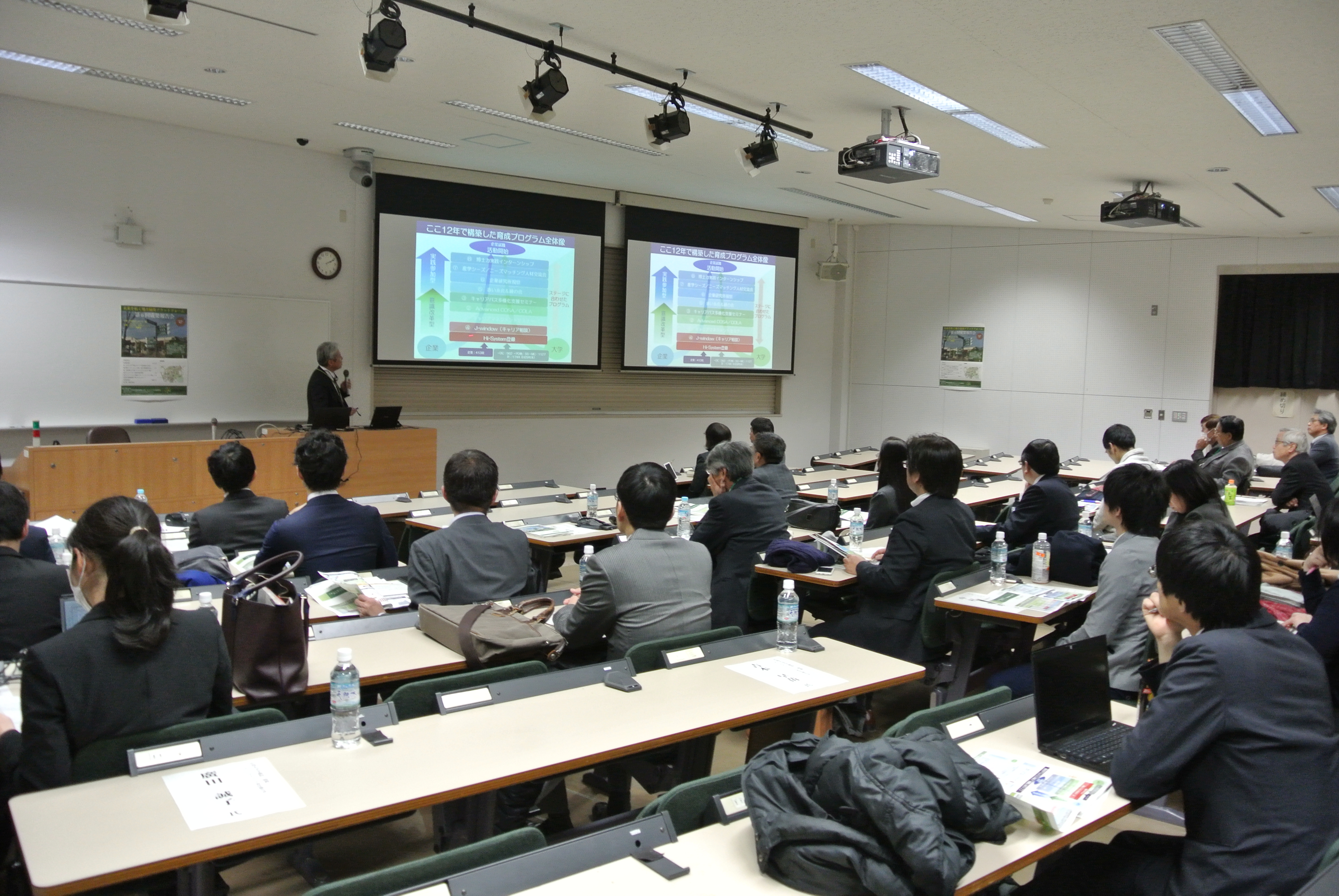 冒頭の堀理事の開会挨拶に続き、北海道大学人材育成本部の樋口特任教授から「北大における博士キャリア支援施策のご紹介」と題して、北大・東北大・名古屋大によるコンソーシアム事業に関する講演がありました。これら三大学の事業もHIRAKUと同じく文部科学省「科学技術人材育成のコンソーシアムの構築事業」によるものであり、出席者にとってもたいへん関心の高いものであることから、質問が相次ぎました。