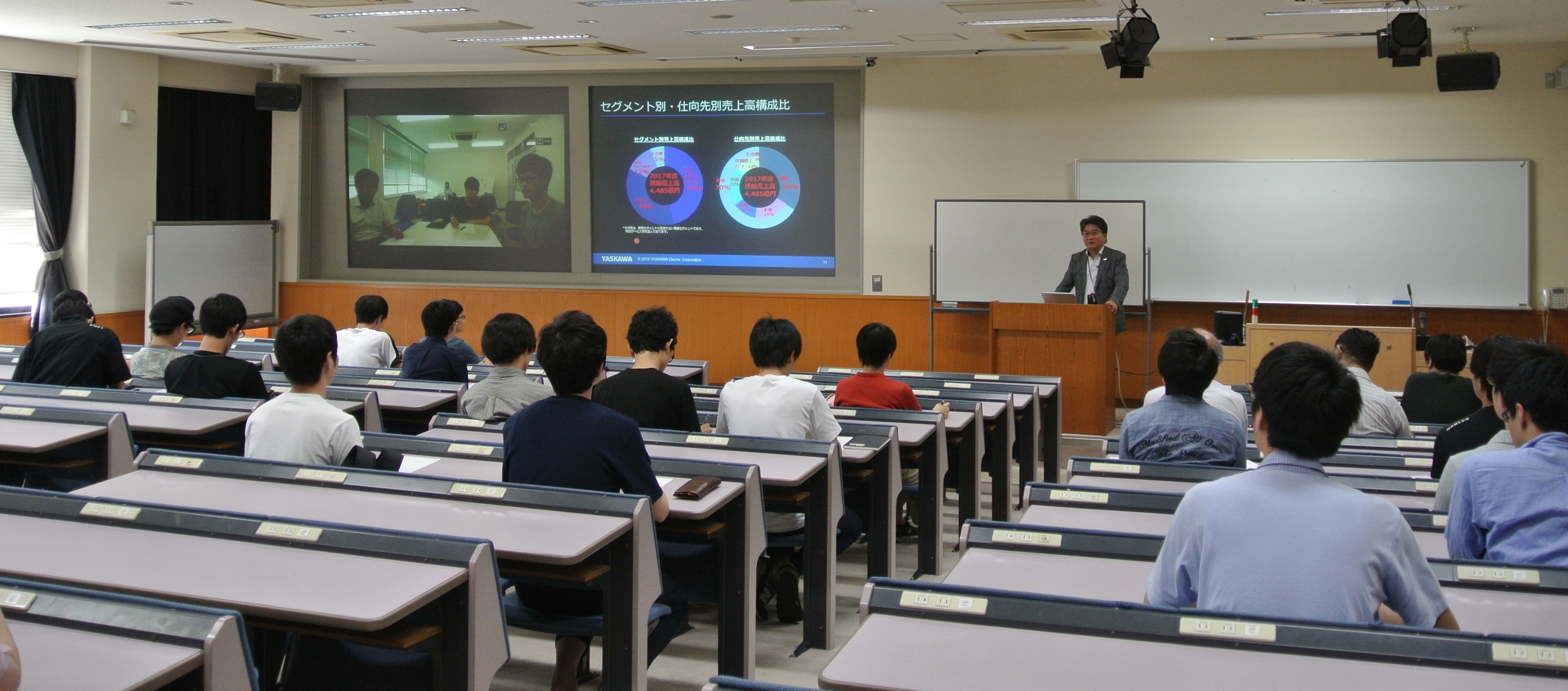 講演では、ロボットの分類・技術の動向・各社の動きに始まり、ドイツ駐在当初に英語が全くできなかったことや、それを克服したこと、海外で要望されたのに対応できなかったことを日本で開発現場に戻った時に実現し、それが市場での成功につながったことなど、技術者としての経験はもちろん、スウェーデンの田舎での生活や大学の事情、自分の山大時代のエピソードも交えて、分かりやすくご紹介いただきました。このような内容であったため、質問も後を絶たず、いったん終了したあとでも遠隔中継を使ってのディスカッションが続きました。
