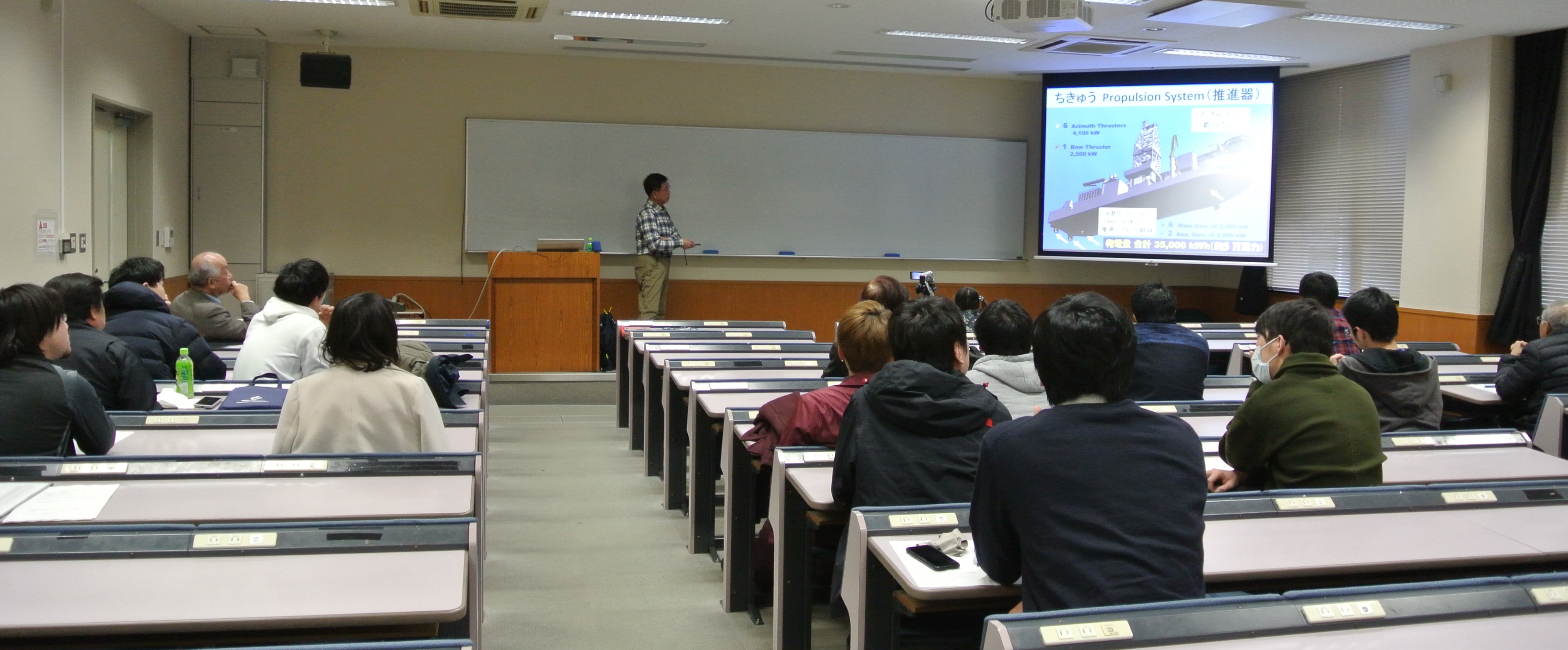 講演では、JAMSTECが所有する地球深部探査船「ちきゅう」による調査の概要から始まり、深さ1万メートル近く(水深4000メートル含む)までの掘削技術、海流や気象変化に対応する仕組み、船を安定に保つ仕掛けなど、調査を支える数々の技術が分かり易く解説されました。また、最新のプロジェクトである南海トラフのプレート沈み込み部分の調査についても説明があり、JAMSTECの組織やこのプロジェクトに関係する山口大学のOBや関係者も紹介されました。講演では更に、JAMSTEC退職後に国際協力機構(JICA)のプロジェクトで、ケニアで地熱発電のために深さ2000メートルの井戸を、「ちきゅう」と同様の技術を使って掘削した経験が、現地の様子や人間関係も含めて紹介されました。